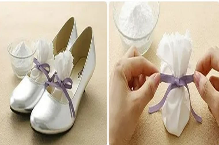 Fortunately, the solution to this dilemma is simple. Grab some tissues, a ribbon, and some baking soda. Add a spoonful of baking soda into each tissue, tie it with a ribbon or piece of string, and pop one into each shoe. Your shoes will remain nice and fresh-smelling for way longer.