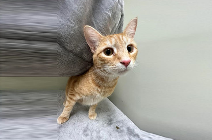 This lively ginger cat is full of energy and curiosity as it explores the vet’s office. With its bright, wide eyes and alert ears, it’s ready to investigate every nook and cranny. The cat’s sleek orange coat and playful nature make it a delightful sight for anyone who crosses its path.