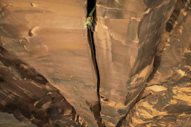 このクライマーは、極端な環境でのクライミングに挑戦しており、自然の地形を相手にした壮絶な試練を象徴しています。岩壁の表面に刻まれた自然の模様が、長い年月を経た地球の歴史を感じさせ、クライマーの姿がそのスケールの大きさを際立たせます。時間が経つにつれ、クライマーは谷底に到達し、静かな岩の風景に再び静寂が戻りました。