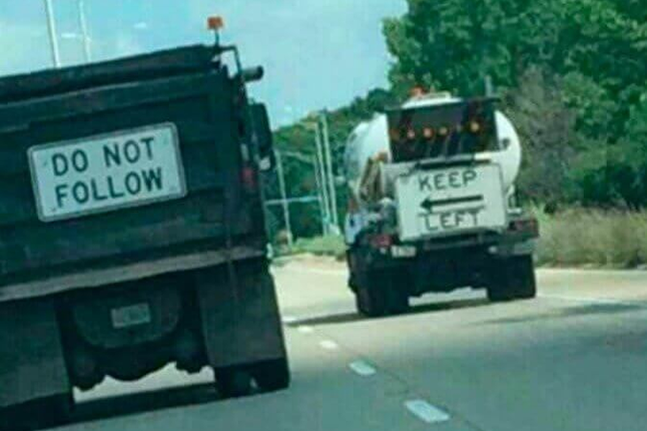 Driving behind large trucks on highways can be risky, particularly when they’re loaded with potentially hazardous cargo. Trucks often have warning signs on the back to alert following drivers. However, a confusing scenario unfolded for some drivers when two trucks with conflicting instructions appeared ahead of them. One truck on the right prompted drivers to “keep left,” while the truck on the left bore a sign that read “do not follow.”