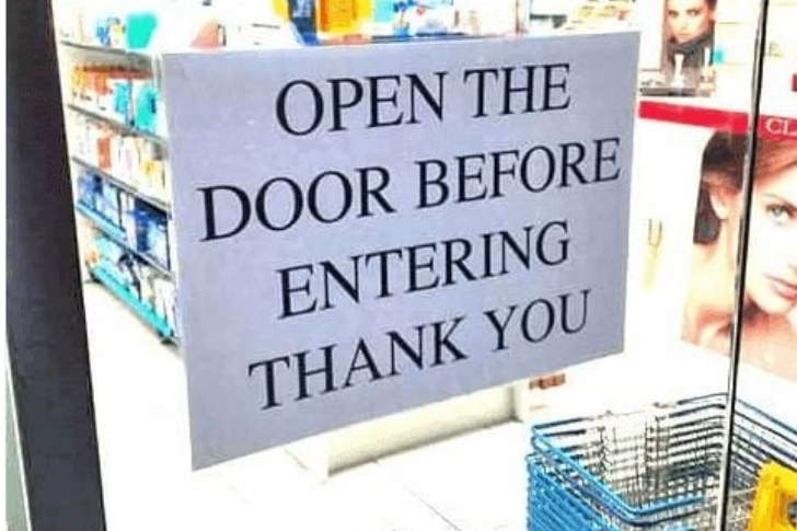 While there aren’t exactly many ways to go through a door, it’s clear the shopkeeper has had their fair share of issues in the past. Maybe it’s time to start handing out technical manuals on door usage. Step one: turn the handle. Step two: push or pull. Step three: walk through. It’s not rocket science, folks!