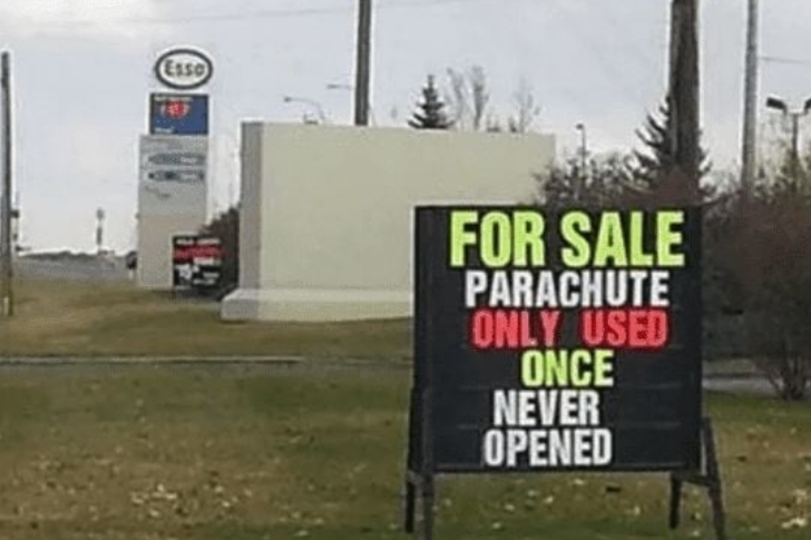 It’s not unusual to come across some odd second-hand ads, but this one would definitely make you smile—along with every other commuter who spots it on the roadside. If you’ve ever considered trying skydiving, this might seem like a golden opportunity to snag a high-quality parachute on the cheap.