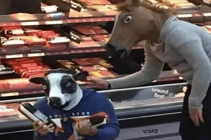These funny folks decided it would be amusing to wander around the store wearing horse and cow masks.