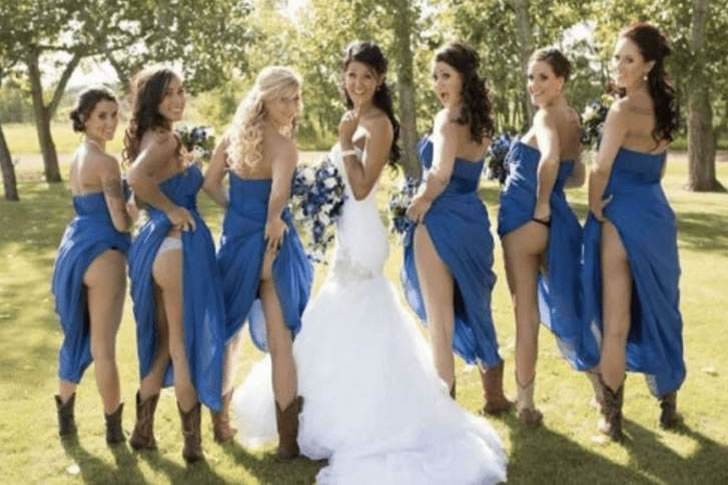 In stark contrast to the previous groom’s casual approach, the bridesmaids here opted for elegance. However, it seems the warm weather prompted a unique solution to cool down, hinting that the bride might also join this trend. Will she reveal a bit more with a playful lift of her veil?