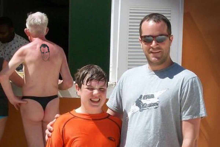 However, the revealing speedo isn’t the only strange thing in this photo. We’re also curious about the reason behind the prominent Richard Nixon back tattoo. If the man is a big fan of the former president, why get the tattoo in a place where he can’t even see it himself?