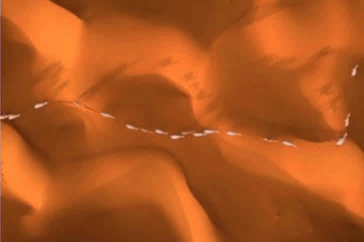 サウジアラビアの広大な赤砂丘を上空から捉えたこの写真は、幻想的な白い線が砂漠を横切る神秘的な光景です。夕日の光に照らされたオレンジ色の砂丘は、まるで生きているかのようにうねり、大きな影がラクダの群れを包み込みます。白い線はラクダたちが歩いた跡で、果てしない砂漠の中を進む彼らの旅路を物語っています。見る者を静寂の世界へと誘うこの景色は、時間の流れを忘れさせる美しさを持っています。