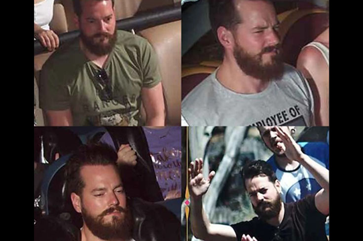 While others around him scream and laugh, Mr. Cool maintains his composed look, making him the star of the ride. His consistent expression adds a humorous twist to the typical roller coaster photo, proving that not everyone gets swept up in the excitement.