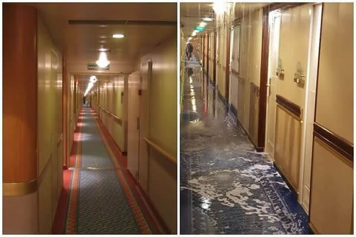 Encountering water in the lower deck hallways during rough seas may prompt flashbacks to cinematic disaster scenes.